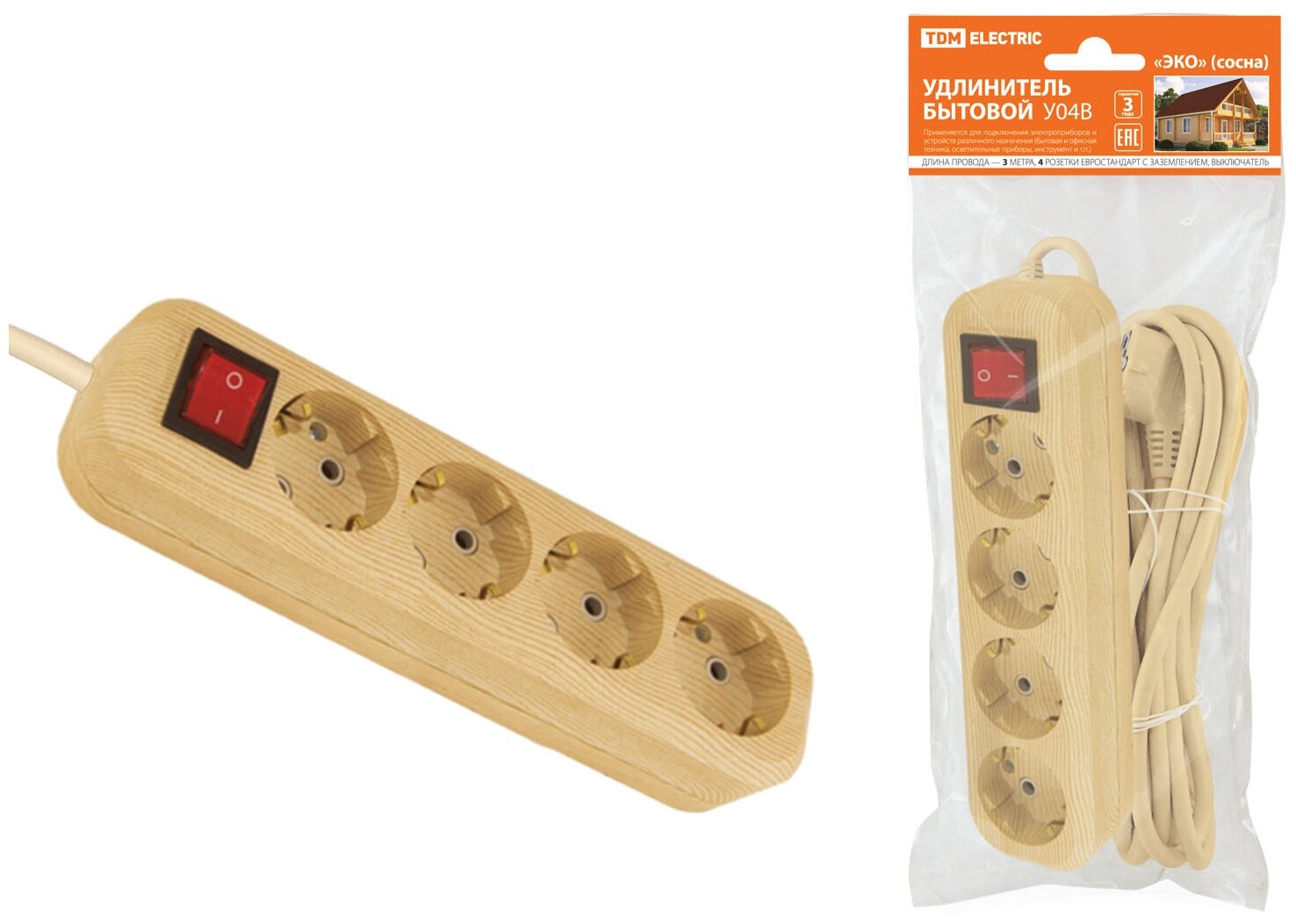 Отзывы на Удлинитель бытовой У04В выключатель, 4 гнезда, 3метра,2П+3, ПВС 3х1мм2 "Эко" (сосна) 16А/250В TDM Артикул SQ1303-2111