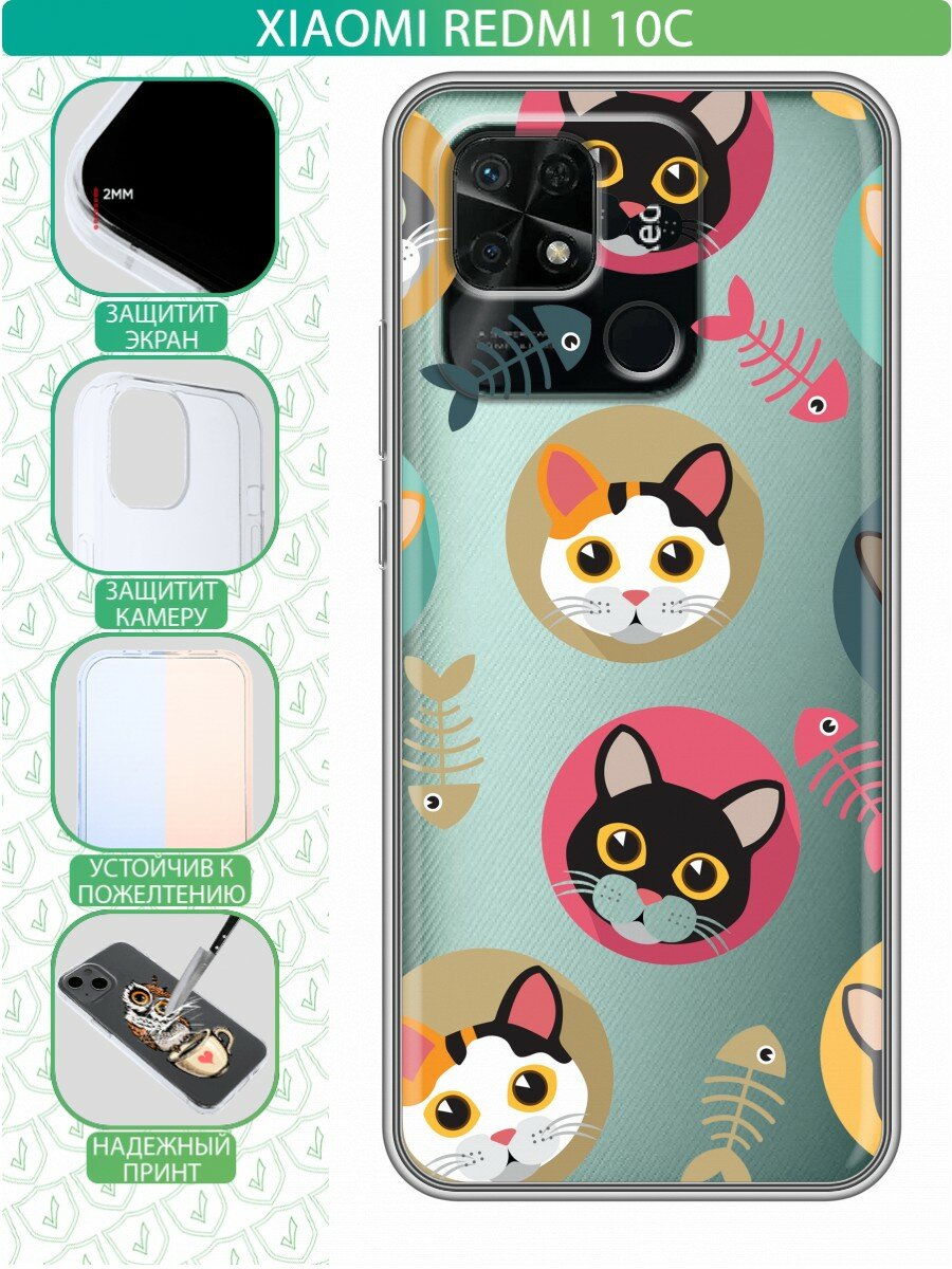 Полупрозрачный дизайнерский силиконовый чехол для Редми 10C / Xiaomi Redmi 10C Кошки принт 579 ₽