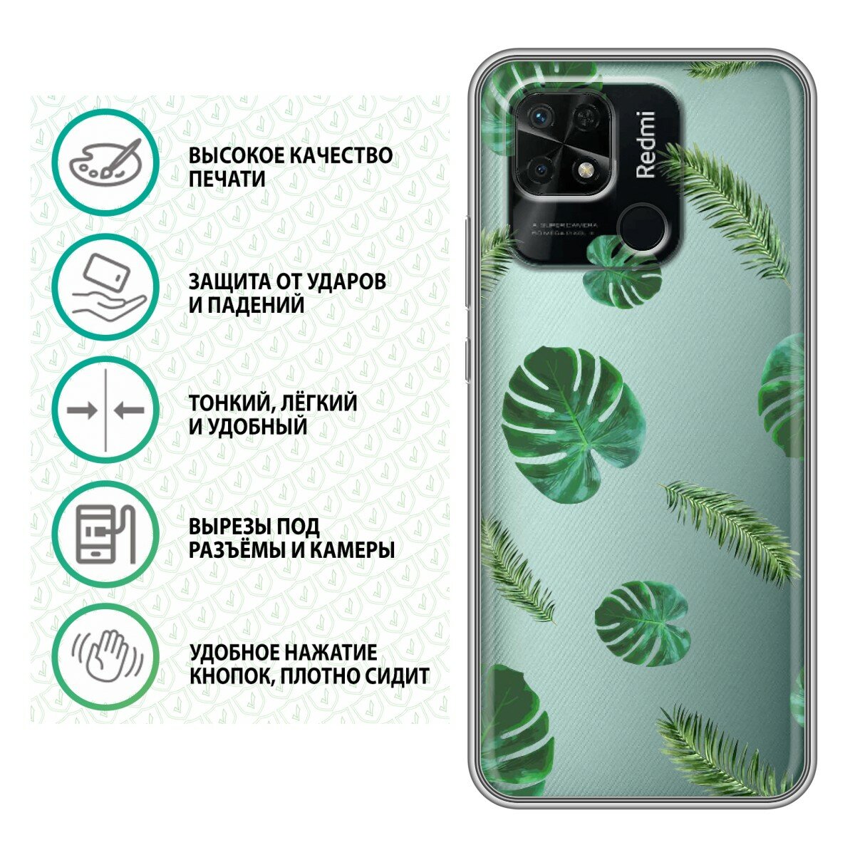 Отзывы на Полупрозрачный дизайнерский силиконовый чехол для Редми 10C / Xiaomi Redmi 10C Зеленые листья паттерн