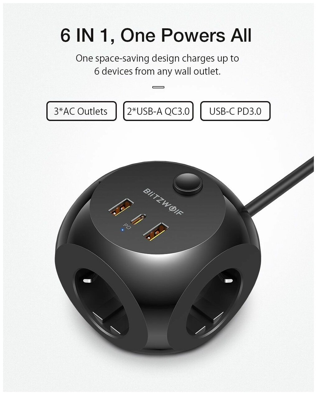 Сетевой удлинитель на 2500 Вт BlitzWolf BW-PC1 20 Вт Type-C PD 3.0 / 18 Вт USB-A x 2 QC3.0 - Черный информация: