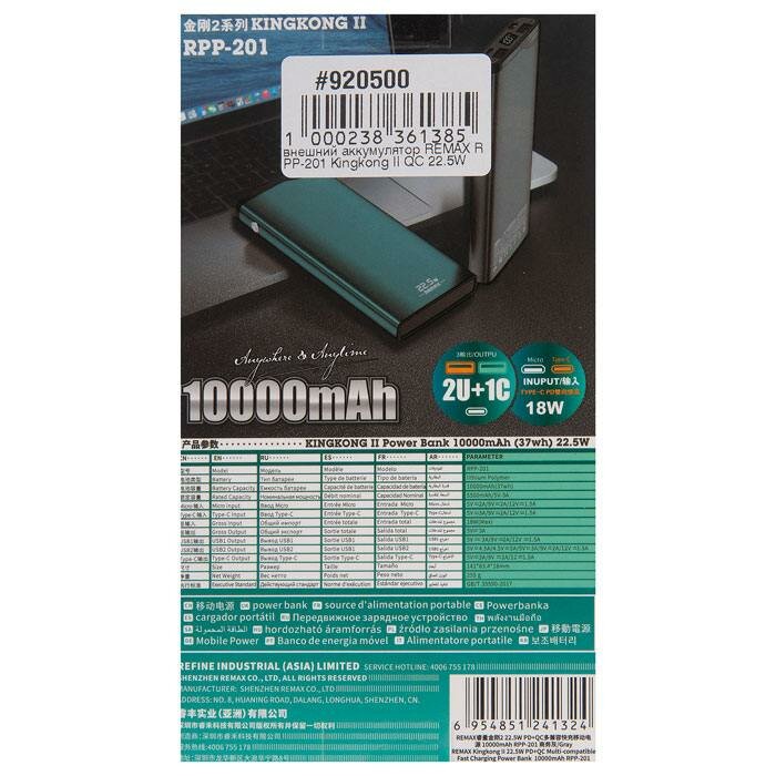 Внешний аккумулятор REMAX RPP-201 Kingkong II QC 22.5W + PD 18W Multi-compatible Power Bank, 3.0 информация: