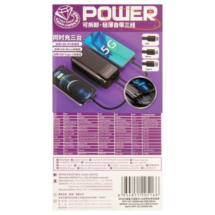 Внешний аккумулятор REMAX RPP-102 Lesu Series Cabled Power Bank, 2.0A, (20000mAh), белый информация: