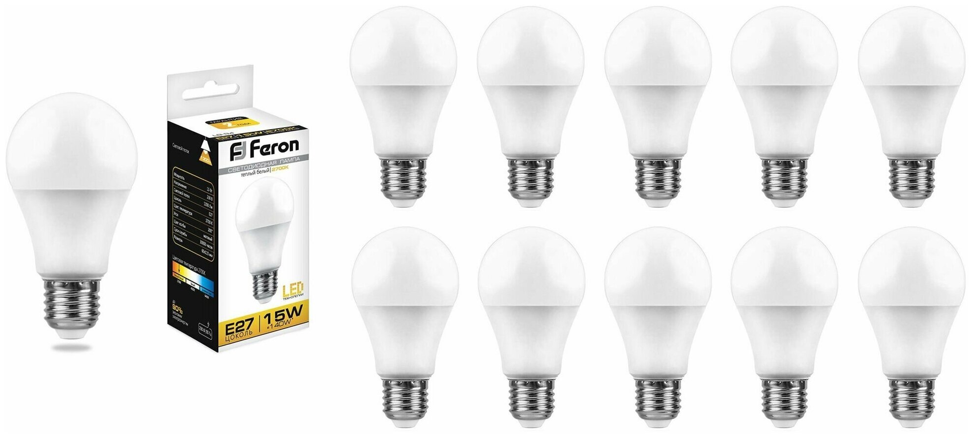 10 цен на Лампочка светодиодная Feron 15W=140W 230V E27 Груша A60 1300Лм Ra>80 2700К, упаковка 10шт.