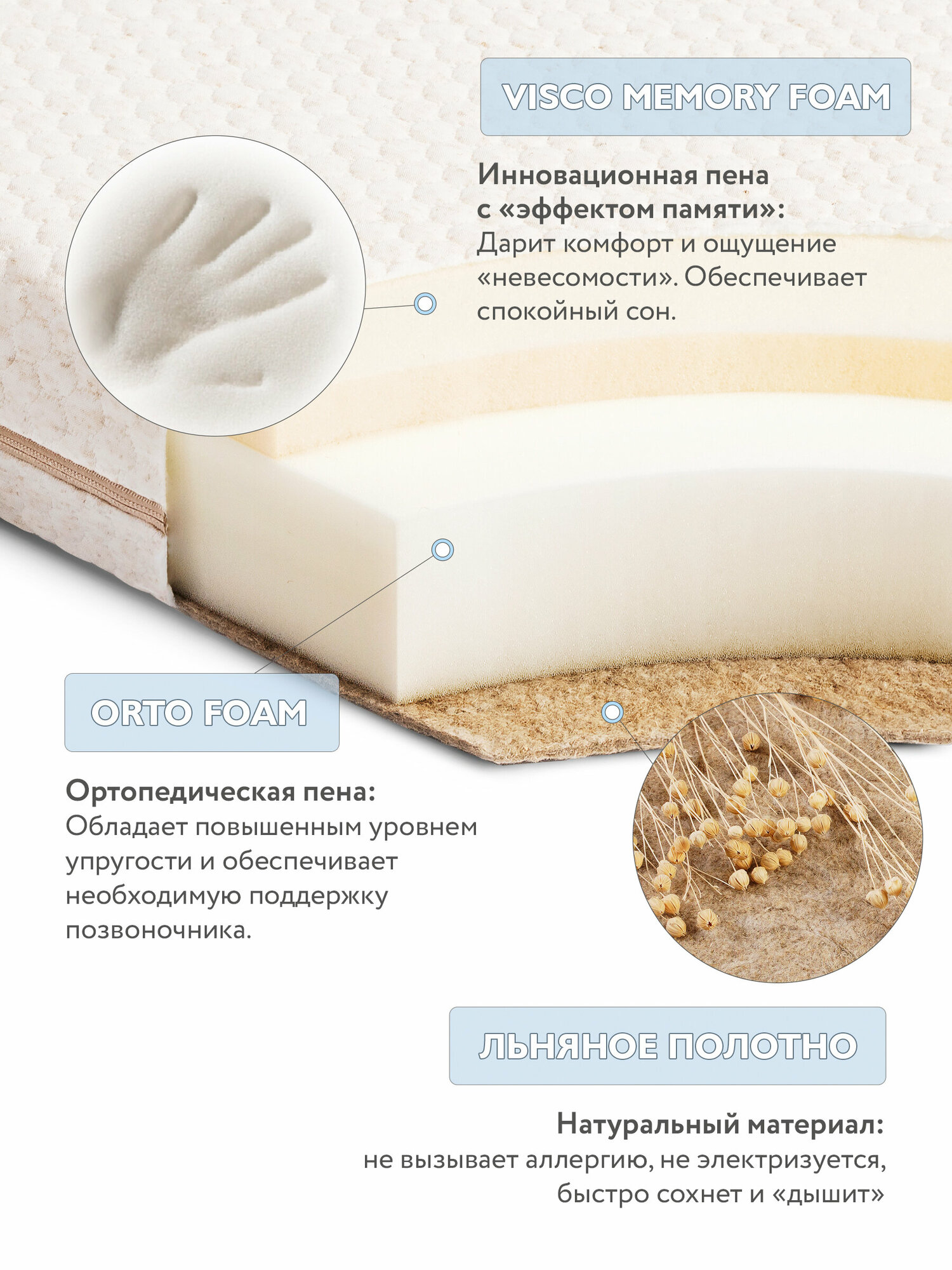 | Дополнительная информация | лен 100%; Memory Foam; ортопедическая пена Ortofoam; анатомический; антибактериальный |