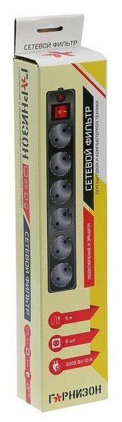 Сетевой фильтр "Гарнизон", 6 розеток, 5 м, 10 А, 2200 Вт, черный информация: