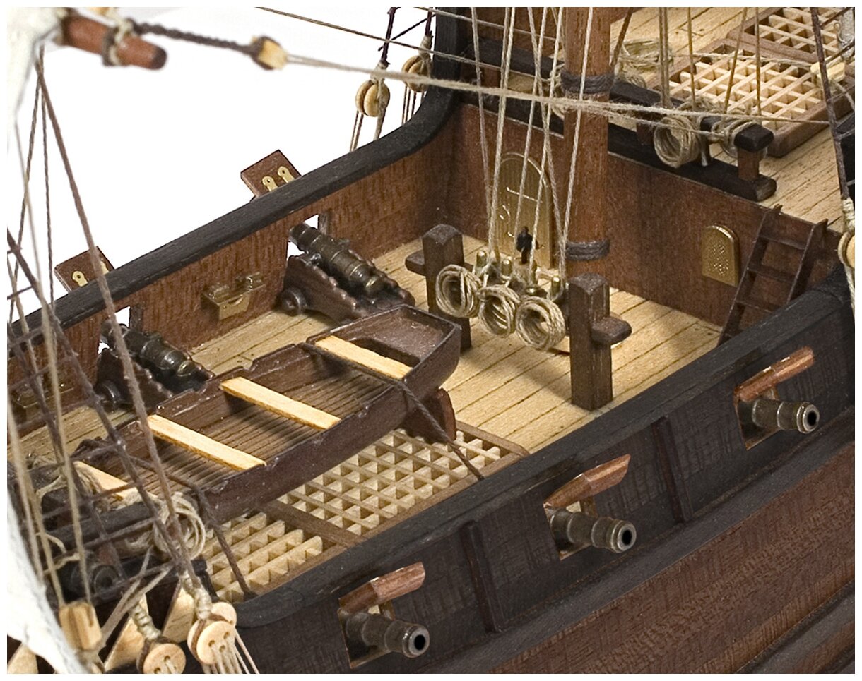 | Комплектация | корпус с двойной обшивкой и настилом палуб отдельными рейками / готовые фальшборта с прорезанными лазерной резкой пушечными портами / деревянные решетки / восемь литых пушек на металлических лафетах и четыре фальш-пушки / кормовой фонарь / якоря / нагеля / эзельгофты / шлюпка из металла / латунные петли для руля / рымы / цепочка / фототравленные двери / утки / сборные трапы / кормовой декор и петли пушечных портов / круглые заготовки светлого дерева для рангоута / светлые и темные нити разных диаметров для такелажа / блоки и юферсы из светлого дерева / готовые паруса / иллюстрированная инструкция |