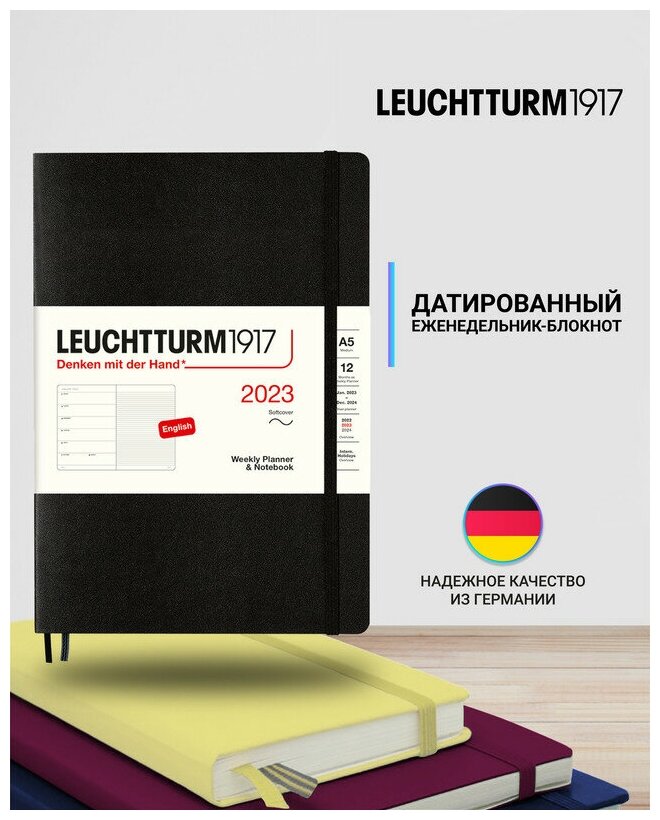 Еженедельник-блокнот Leuchtturm1917 Medium A5 (14.5x21см.) датированный на 2023 год, 80г/м2 - 144стр., мягкая обложка, цвет: черный
