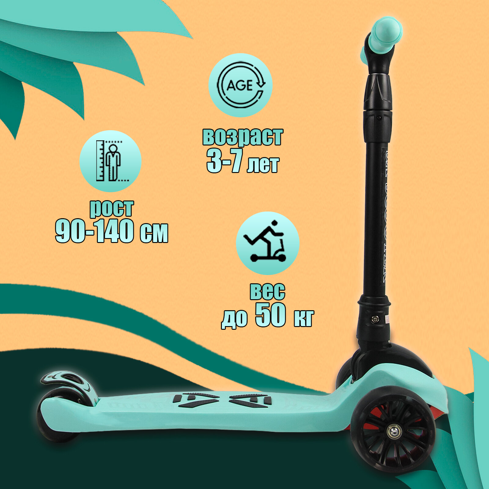 Самокат трехколесный мятный SX Супер Макси складной, светящиеся колеса информация: