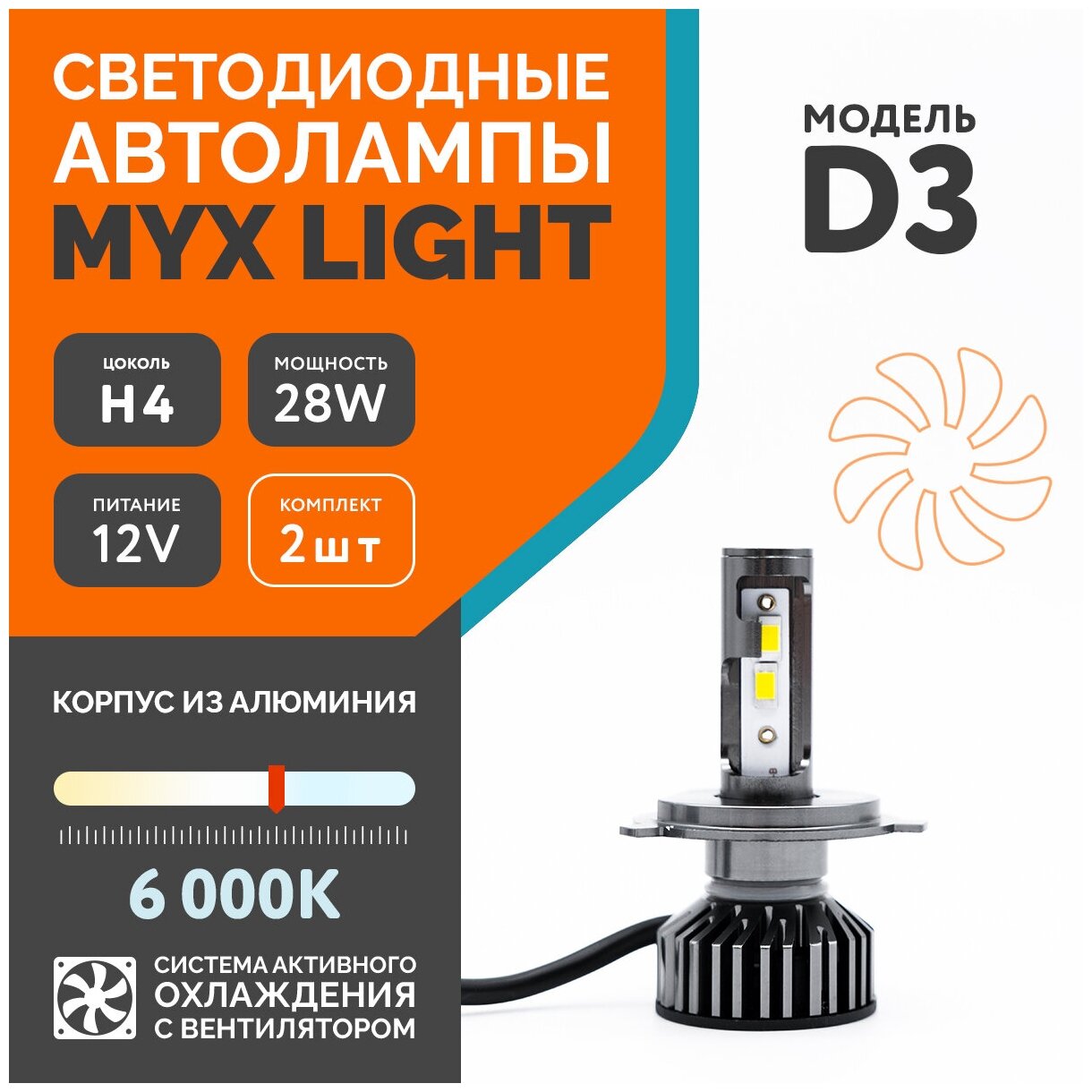 Автолампы светодиодные MYX Light D3, напряжение 12V, мощность 28W, чип CSP 3570, температура света 6000K, комплект 2 шт., цоколь H4 информация: