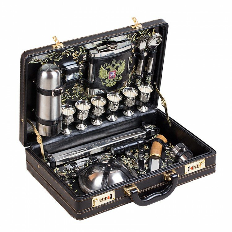 | Комплектация | 1. Кейс из кожзаменителя с внутренней отделкой из натуральной кожи. Рисунок нанесен методом УФ-печати! 1шт. 2. Термос из нержавеющей стали 0,35 л 1шт. 3. Фляжка из нержавеющей стали 0,5 л 1шт. 4. Вилки из нержавеющей стали 6шт. 5. Ложки из нержавеющей стали 6шт. 6. Рюмки из стали с никель-серебрянным покрытием 6шт. 7. Мангал складной из нержавеющей стали 1шт. 8. Шампура из нержавеющей стали 6шт. 9. Нож охотничий из нержавеющей стали и рукоятью из ореха и латуни 1шт. 10. Тарелки из нержавеющей стали 6шт. 11. Стаканы из нержавеющей стали 6шт. 12. Воронка из нержавеющей стали для заполнения фляжки 1шт. 13. Штопор сомелье 1шт. 14. Вилка из нержавеющей стали для мяса 1шт. 15. Чехол для кейса из высокопрочного прозрачного пластика предназначенный для защиты от влаги и сохранения товарного вида 1шт. 16. Нож складной перочинный многофункциональный 1шт. |