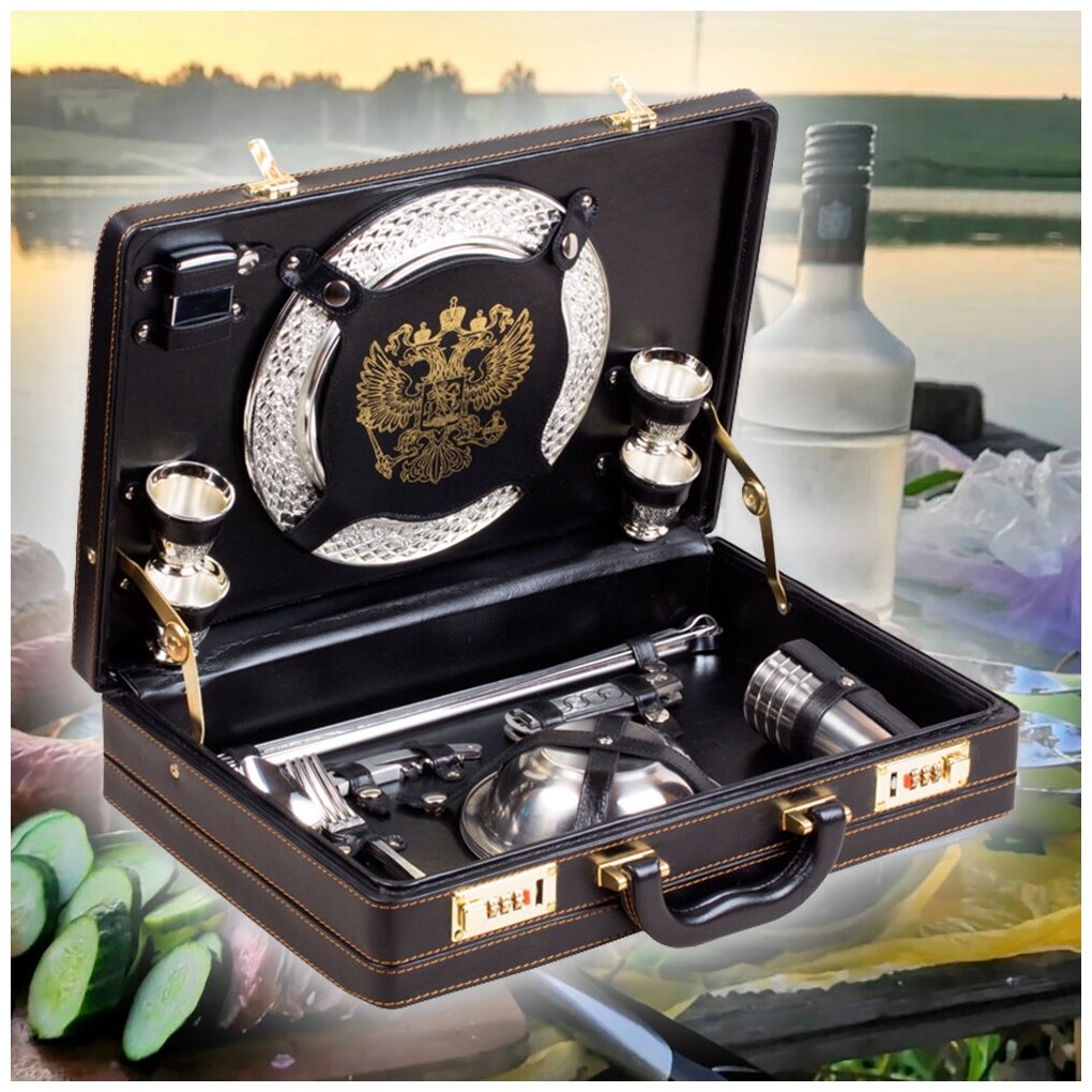 | Комплектация | Кейс из искусственной кожи, вилки из нержавеющей стали - 4 шт., ложки из нержавеющей стали - 4 шт., стопки из стали с никель-серебряным покрытием - 4 шт., блюда для закусок из стали с никель-серебряным покрытием - 2 шт., шампуры из нержавеющей стали - 4 шт., нож складной из нержавеющей стали, тарелки из нержавеющей стали - 4 шт., стаканы из нержавеющей стали - 4 шт., зажигалка, штопор-сомелье, чехол для кейса из высокопрочного прозрачного пластика, предназначенный для защиты от влаги и сохранения товарного вида |