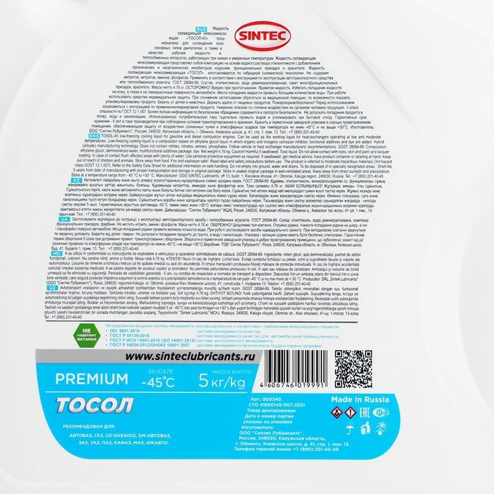 Тосол Sintec ОЖ - 45, 5 л информация: