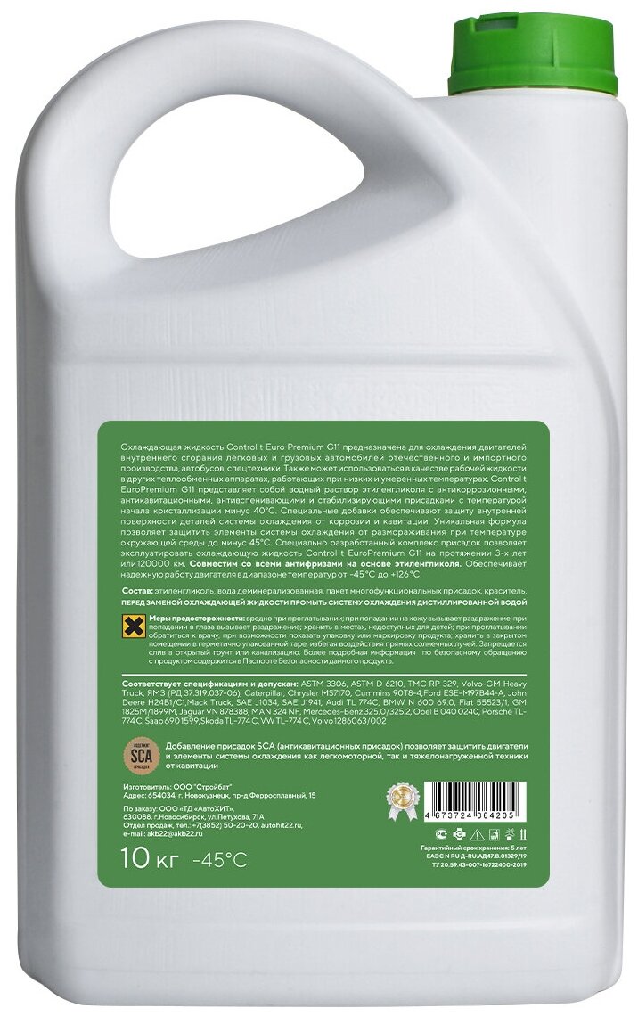 Антифриз Control T Europremium G11 зелёный 10кг информация: