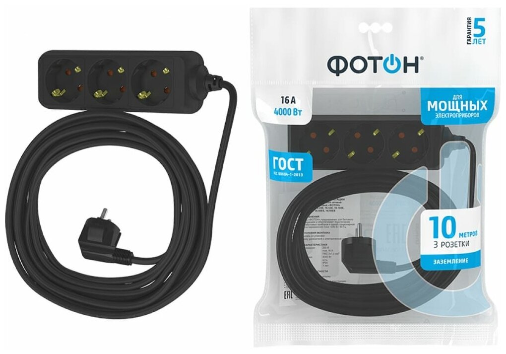 Отзывы на Удлинитель сетевой "фотон" 16-103Е, 10м, 3 розетки, с заземлением, черный, ГОСТ