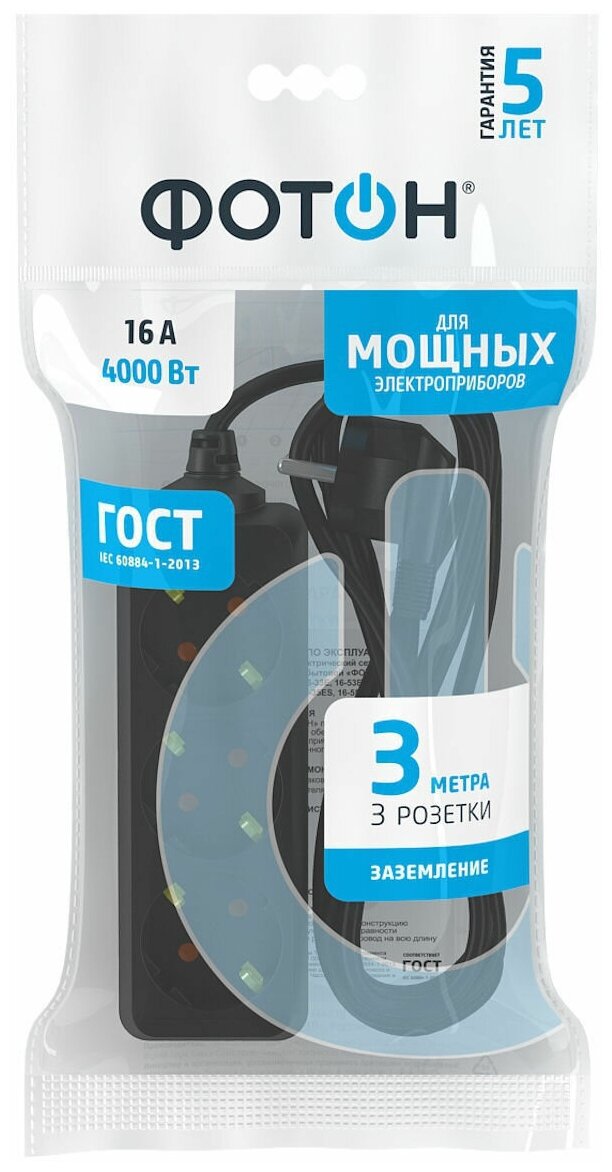 Отзывы на Удлинитель сетевой "фотон" 16-33Е, 3м, 3 розетки, с заземлением, черный
