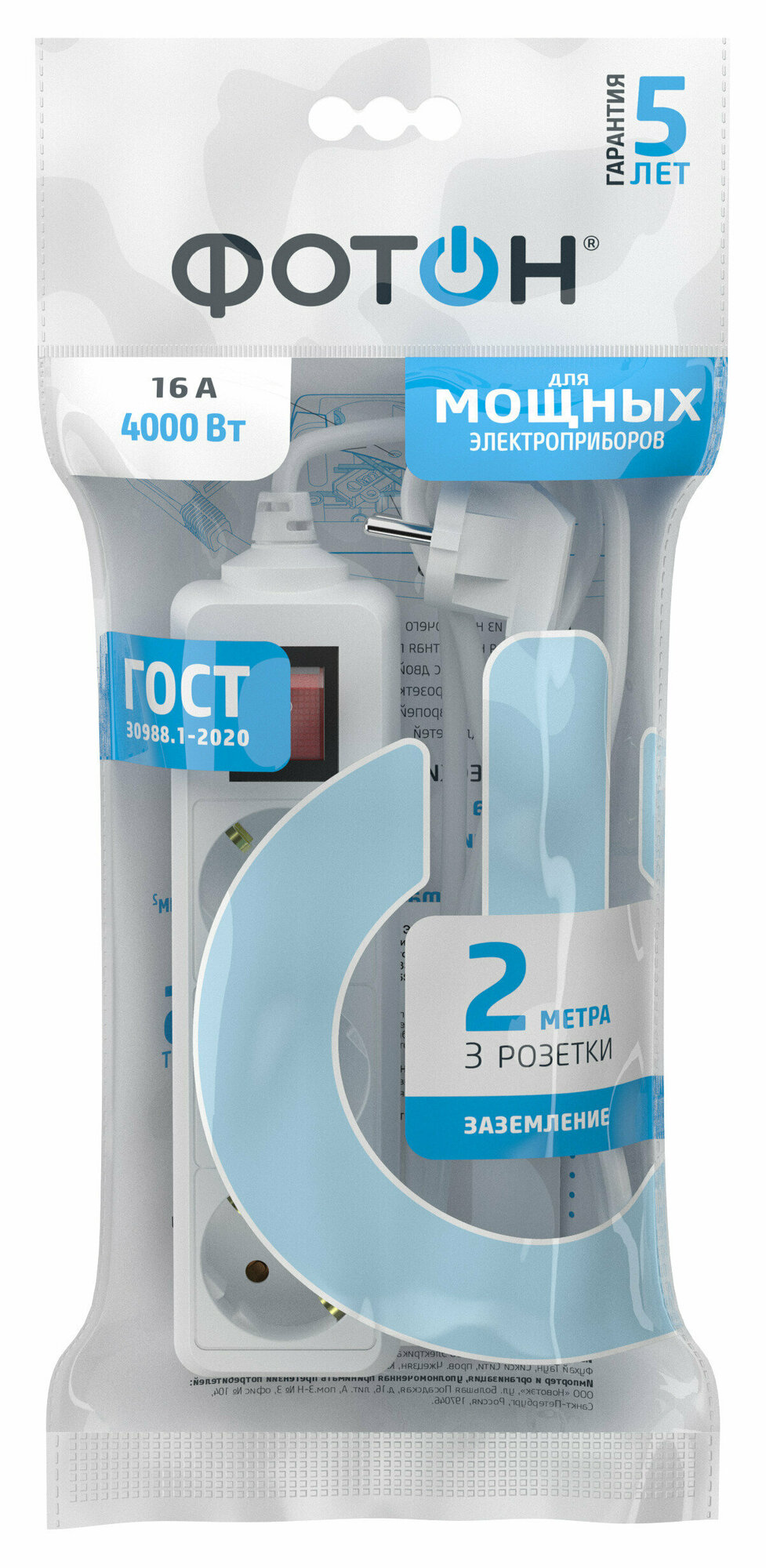 Отзывы на Сетевой удлинитель фотон 16-23ЕS, 2м, 3 розетки, 16А, с выключателем, с заземлением, Белый 24751