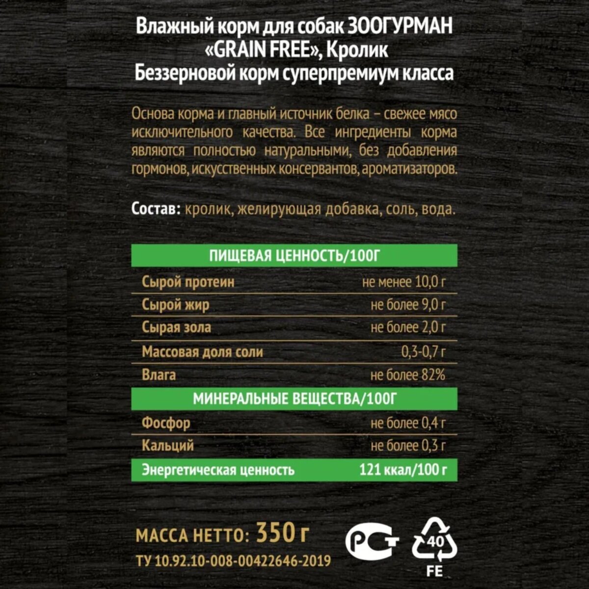 Зоогурман Grain Free кон.д/собак Кролик 350г информация:
