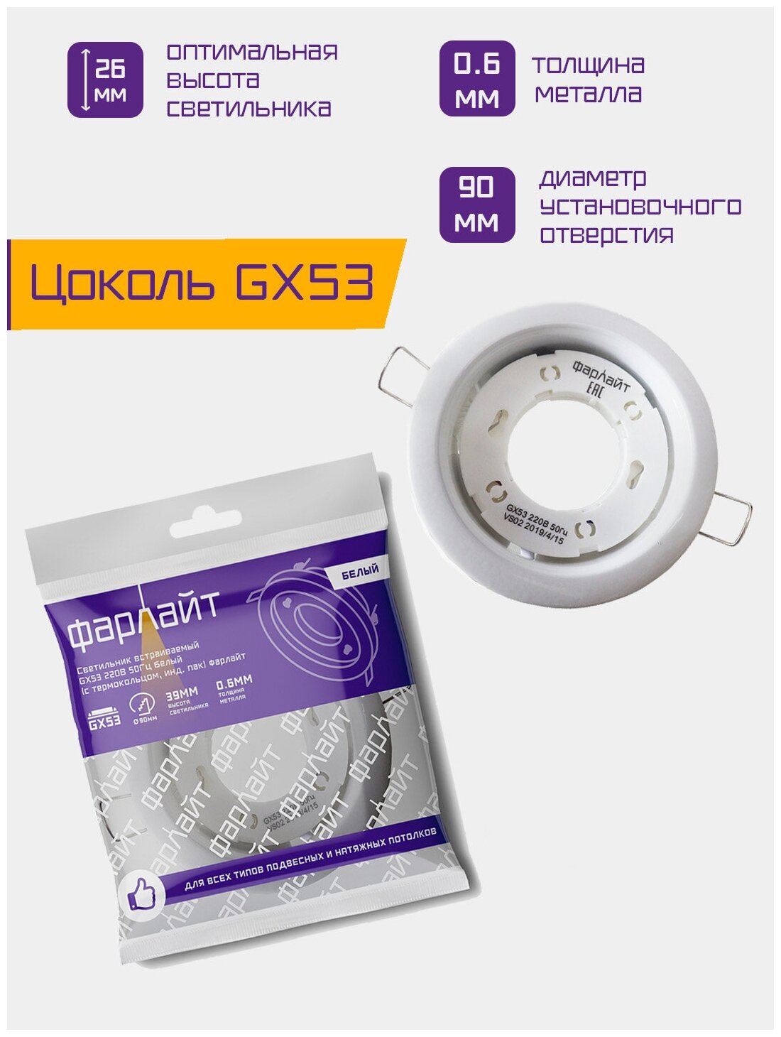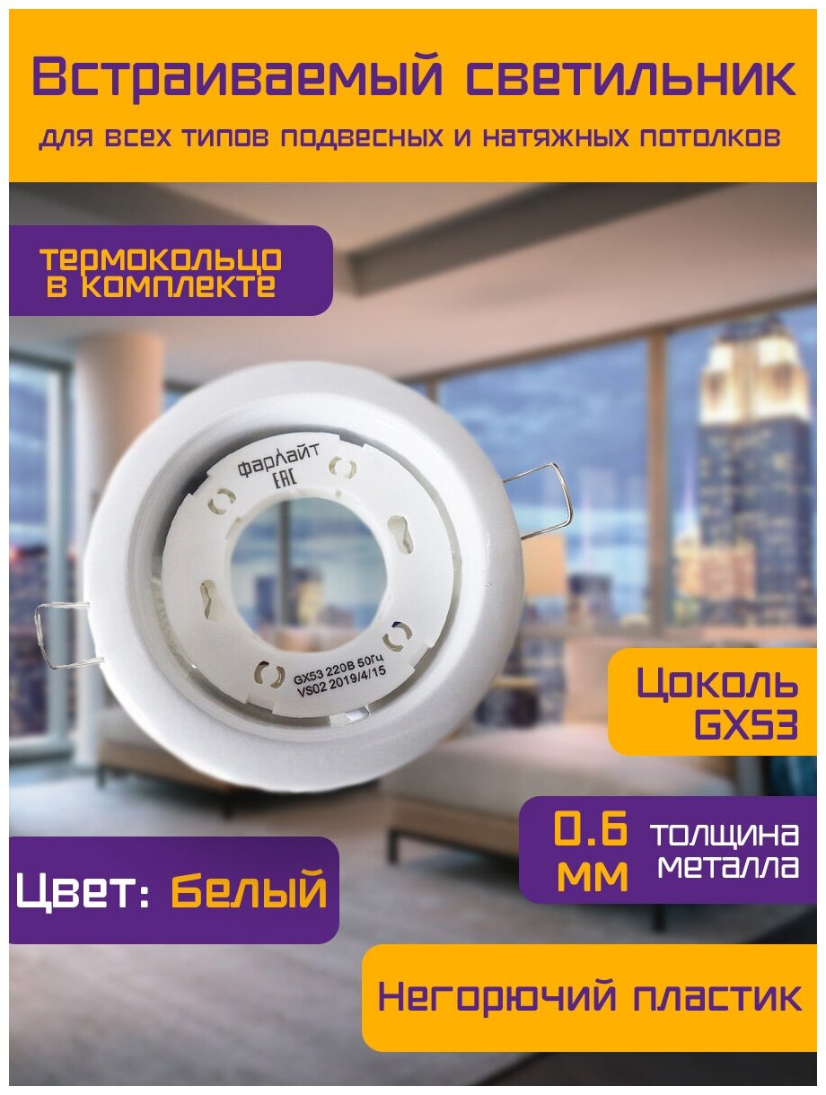 Светильник встраиваемый GX53 220 В 50 Гц белый (с термокольцом, инд. пак ) Фарлайт информация: