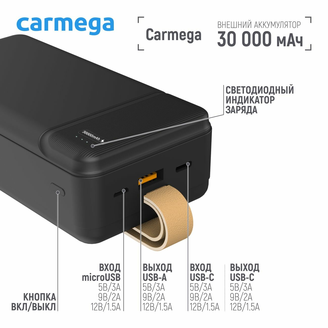 Внешний аккумулятор Carmega 30000mAh Charge PD30 black (CAR-PB-205-BK) информация: