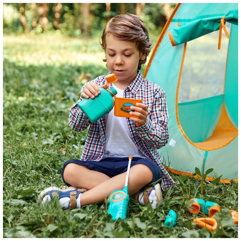 Детская игровая палатка "Набор Туриста" с набором для пикника 6 предметов: фляга, лопатка, бинокль, рации 2 шт., мультиприбор (свисток, фонарик, компа