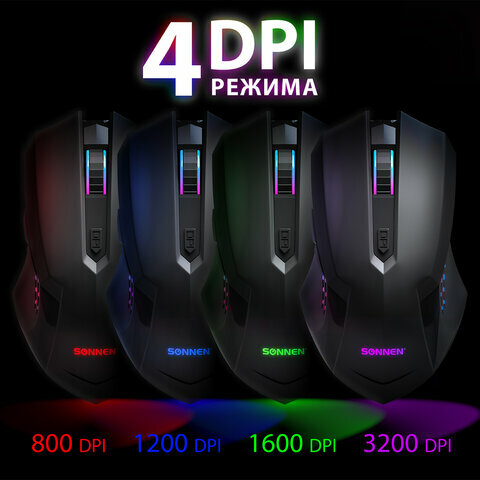 10 цен на Мышь проводная игровая SONNEN I3, комплект 5 шт., пластик, 6 кнопок, 800-2400 dpi, LED-подсветка, черная,513523