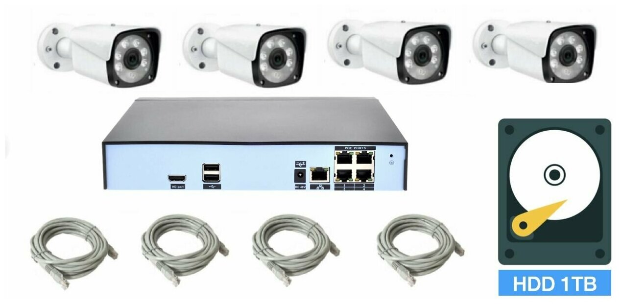 10 цен на Полный IP POE комплект видеонаблюдения на 4 камеры (KIT4IPPOE20MB3_HDD1TB_UTP-2)