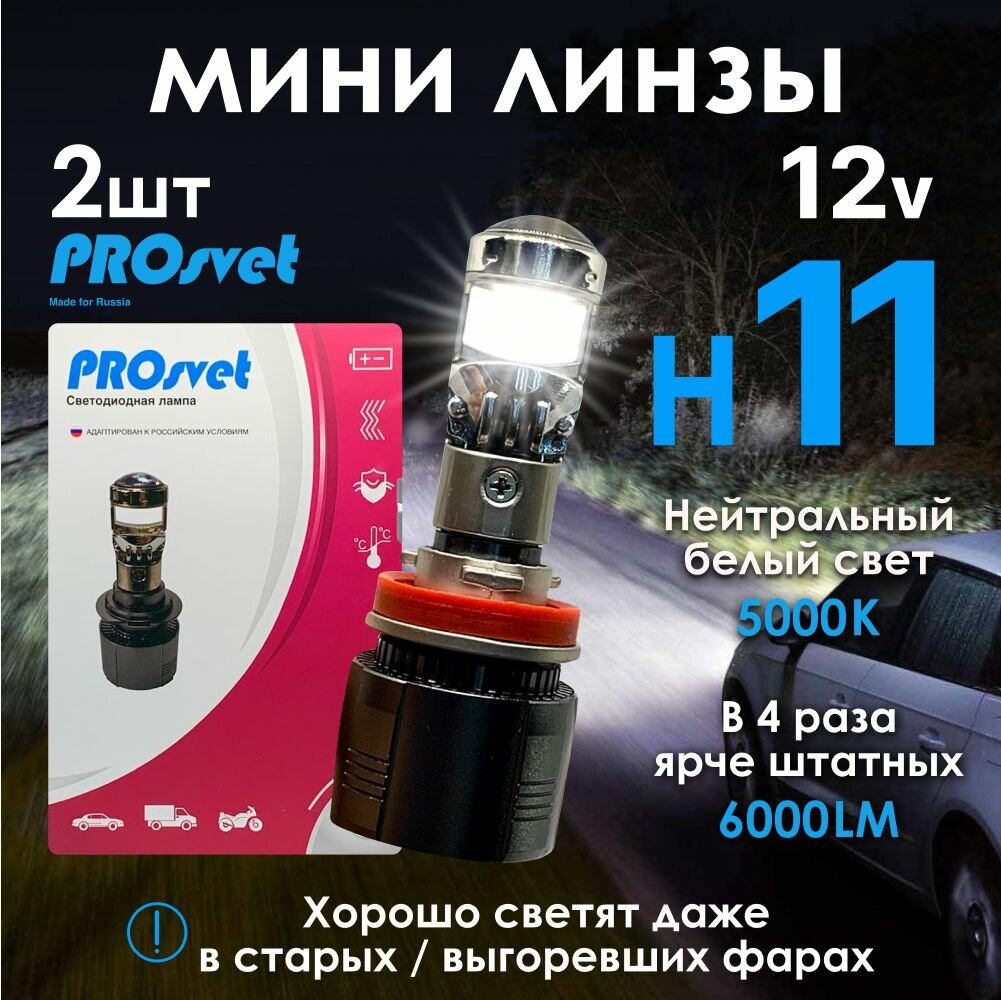 Светодиодные LED лампы головного света с линзой PROSVET S7 H11 информация: