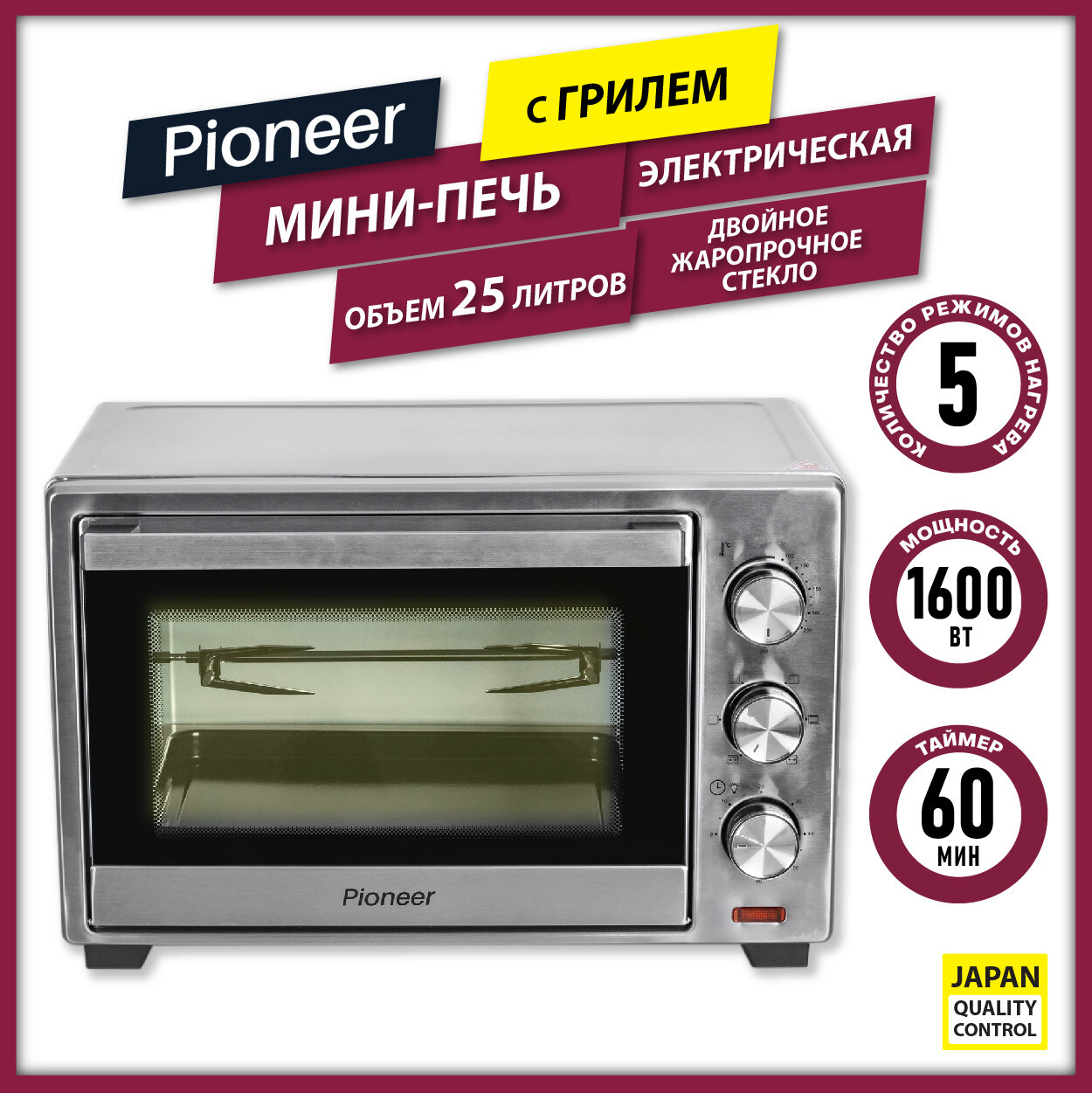 Мини печь электрическая 32л с КОНВЕКЦИЕЙ, ГРИЛЕМ Pioneer MO5018G, вертел, форма для пиццы, насадка для шашлыка, 1600 Вт