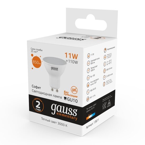 Отзывы на Светодиодная лампа Gauss Elementary MR16 11W 850lm 3000K GU10 LED 1/10/100