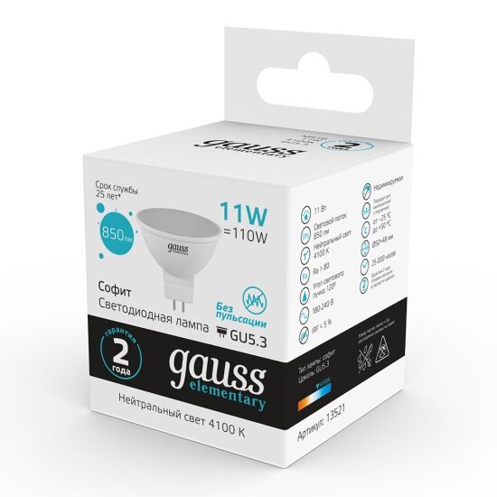 Отзывы на Светодиодная лампа Gauss Elementary MR16 11W 850lm 4100K GU5.3 LED 1/10/100