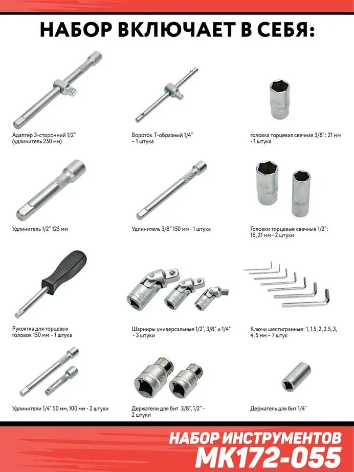 | Головки торцевые подробно | 1/4": 4, 4.5, 5, 5.5, 6, 7, 8, 9, 10, 11, 12, 13, 14 мм; Torx 1/4": E4, E5, E6, E7, E8; длинные 1/4": 4, 5, 6, 7, 8, 9, 10 мм; удлинитель 1/4": 50, 100 мм; вороток т-образный 1/4"; с битами 1/4": H2, H3, H4, H5, H6, SL4, SL5.5, SL7, PH1, PH2, PH3, PZ1, PZ2, PZ3, T8, T9, T10, T20, T25, T27, T30, TT8, T9, T10, T15, T20, T25, T27, T30; 3/8": 10, 11, 12, 13, 14, 15, 16, 17, 18, 19 мм; Torx 3/8": E10, E11, E12, E14, E16, E18; длинные 3/8": 10, 11, 12, 13, 14, 15 мм; свечные 3/8": 21 мм; удлинитель 3/8": 150 мм; 1/2": 10, 11, 12, 13, 14, 15, 16, 17, 18, 19, 20, 21, 22, 24, 27, 30, 32 мм; Torx 1/2": E20, E24; удлиненные 1/2": 16, 17, 18, 19, 22 мм; свечные 1/2": 16, 21 мм; удлинитель 1/2": 125, 250 мм; трещотка 1/2", 3/8", 1/4": 24 зуба; карданный шарнир 1/2", 3/8", 1/4" |