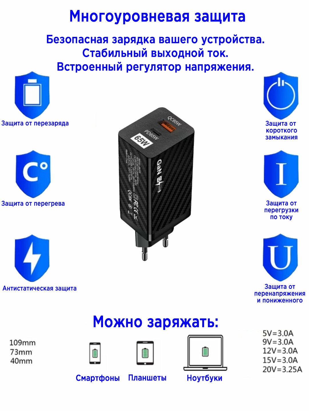 | Особенности | GaN / защита от перегрева / защита от перенапряжения |