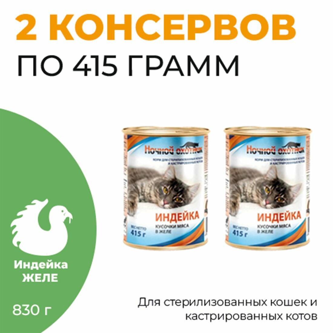Консервы для кошек ночной охотник 2 шт по 415г Индейка для стерилизованных кошек и кастрированных котов в желе