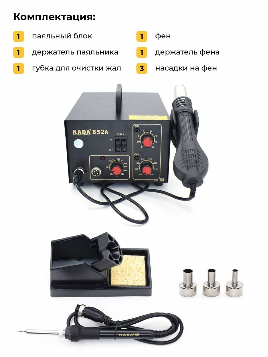 | Комплектация | паяльный блок, держатель паяльника, губка для очистки жал, фен, держатель фена, насадки на фен 3 шт. |