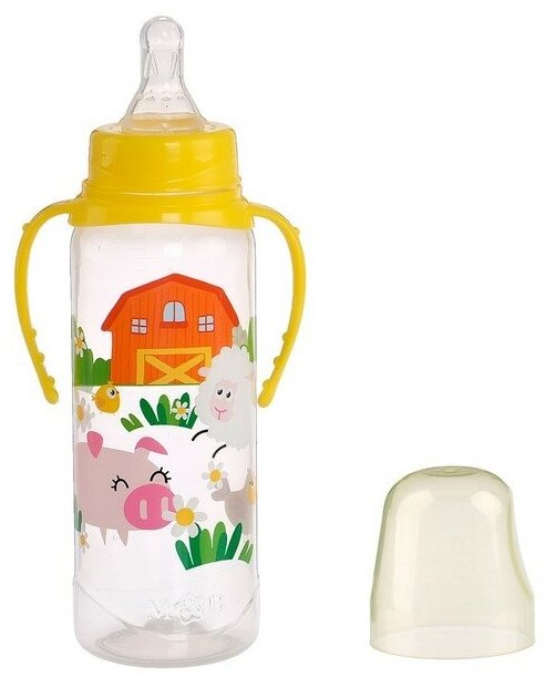 Mum&Baby Бутылочка для кормления "Весёлая ферма" детская классическая, с ручками, 250 мл, от 0 мес., цвет жёлтый