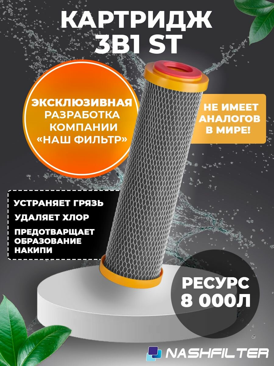 Картридж для фильтра воды 3 в 1 ST 10SL (ионообменная смола, вспененное полипропиленовое волокно, углеродное волокно) информация:
