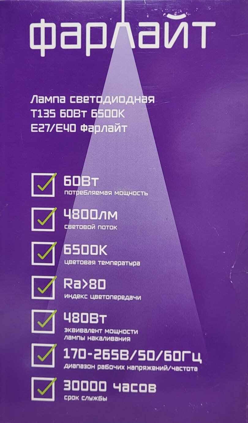 Лампа светодиодная Т135, 60 Вт, 6500 К, Е27, E40 Фарлайт информация: