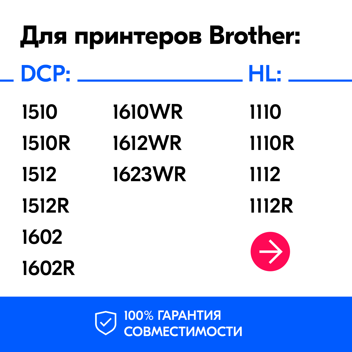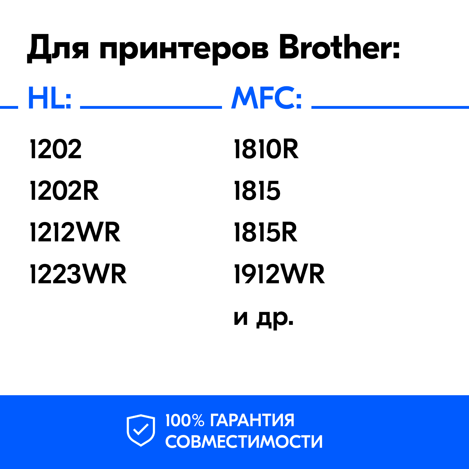 | Совместимые устройства | Brother DCP-1510, Brother DCP-1510R, Brother DCP-1512, Brother DCP-1512R, Brother DCP-1610WR, Brother DCP-1612WR, Brother HL-1110, Brother HL-1110R, Brother HL-1112, Brother HL-1112R, Brother HL-1210WR, Brother HL-1212WR, Brother MFC-1810, Brother MFC-1810R, Brother MFC-1815, Brother MFC-1815R, Brother MFC-1910, Brother MFC-1910W, Brother MFC-1912WR |