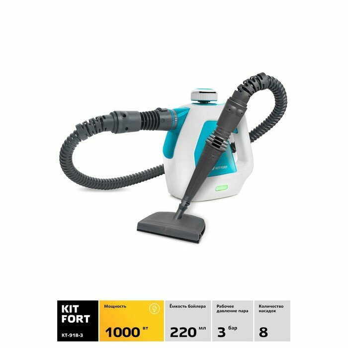 Пароочиститель Kitfort КТ-918-3, 1000 Вт, 220 мл, 3 бар, шнур 5 м, бирюзовый информация: