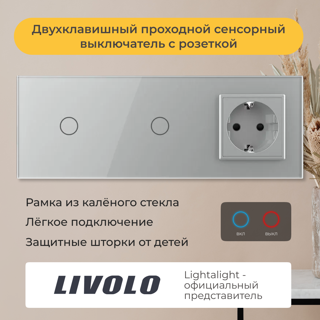 Отзывы на Двухклавишный проходной сенсорный выключатель Livolo с розеткой (VL-C701S/C701S/C1EU-15)