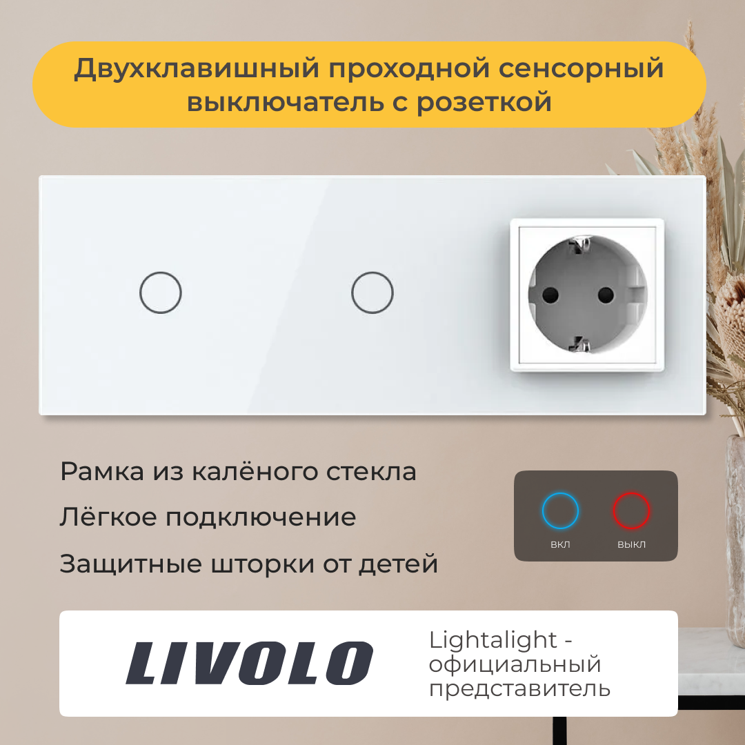 Отзывы на Двухклавишный проходной сенсорный выключатель Livolo с розеткой (VL-C701S/C701S/C1EU-11)