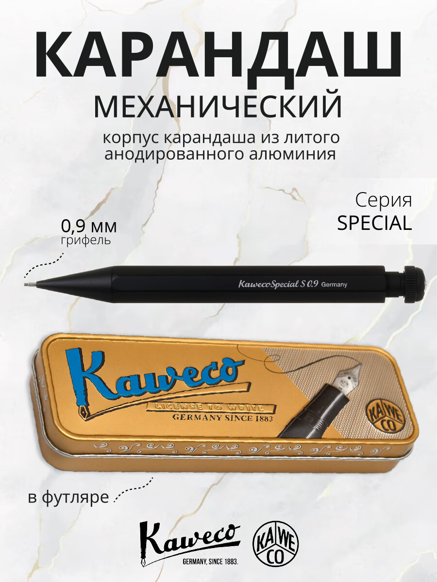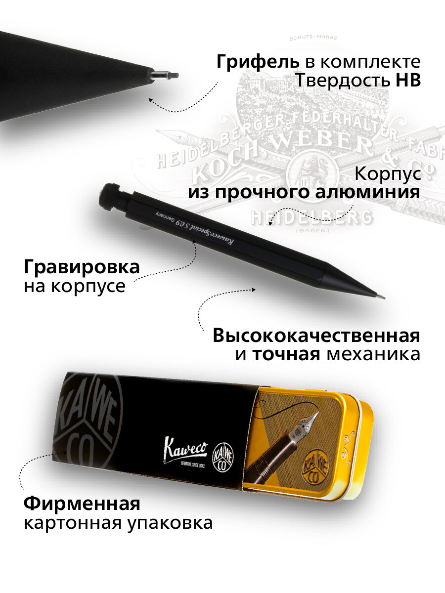 Карандаш механический KAWECO SPECIAL S AL Mini 0.9мм с ластиком чёрный корпус (алюминий) в подарочном футляре информация: