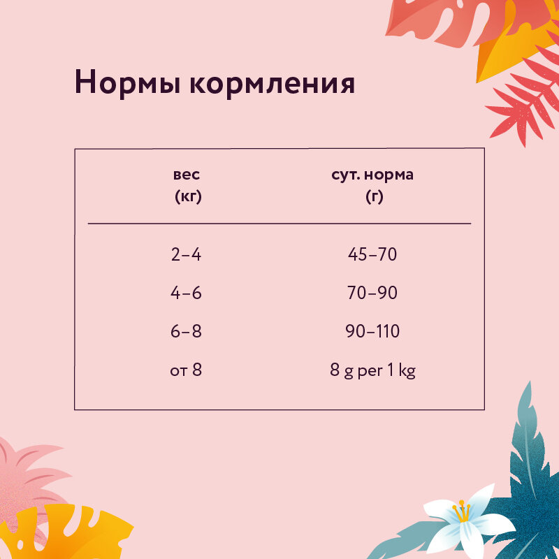 | Особые потребности | гипоаллергенный / для беременных / кормящих кошек / для вывода шерсти / для живущих в помещении / для живущих на улице / для здоровья кожи и блеска шерсти / для здоровья костей и суставов / для профилактики стресса / для снижения запаха стула / для стерилизованных/кастрированных / при чувствительном пищеварении / профилактика МКБ / профилактика зубного камня / профилактика избыточного веса |