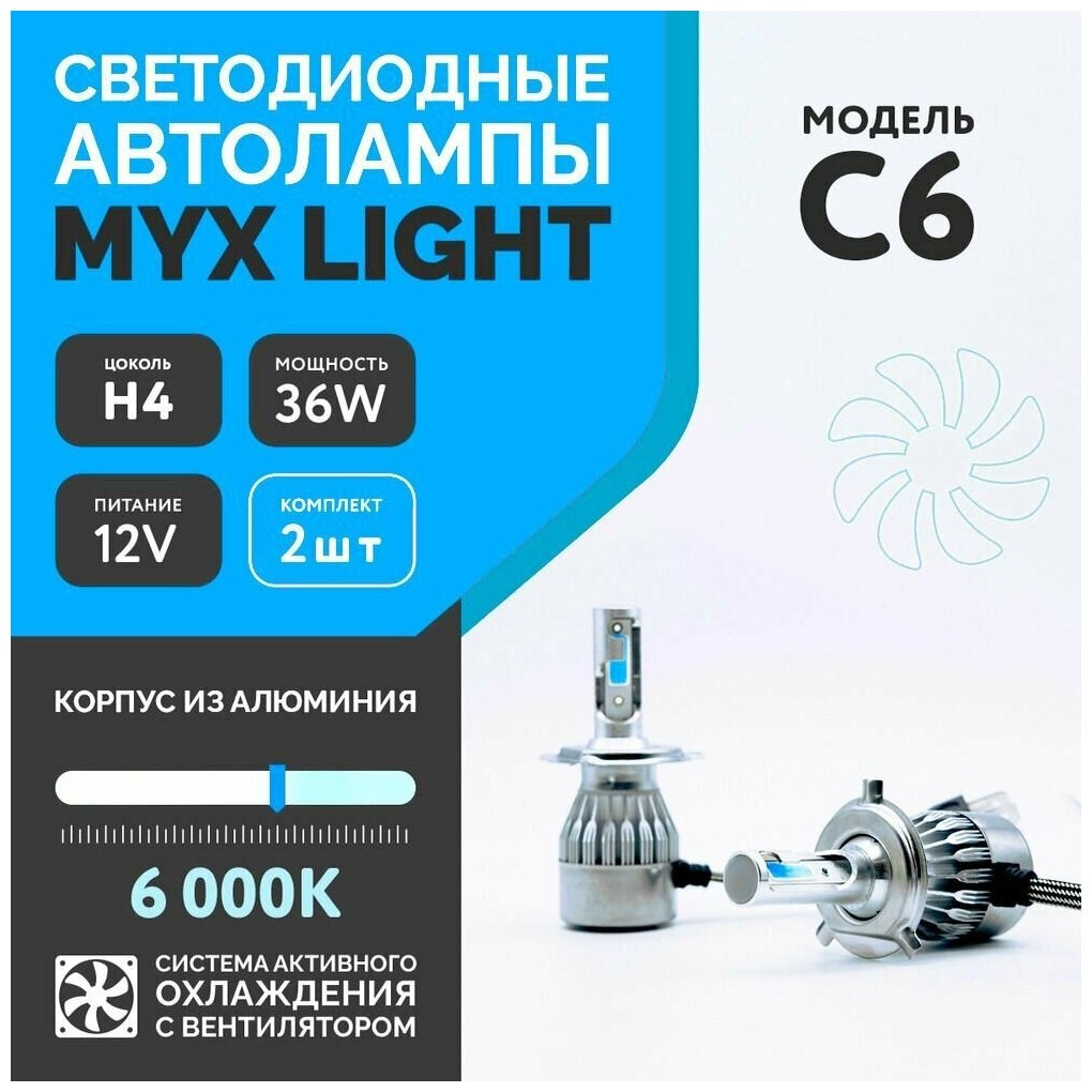 Светодиодные автомобильные лампы C6, цоколь H4, напряжение 12V, мощность 36W, LED чип COB, с вентилятором, температура света 6000K, 2 шт. информация: