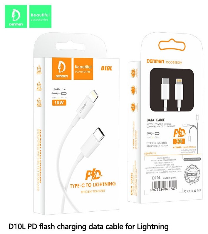 Кабель для быстрой зарядки Denmen D10L Type-C to Lightning, PD20W, 1 м, Белый информация: