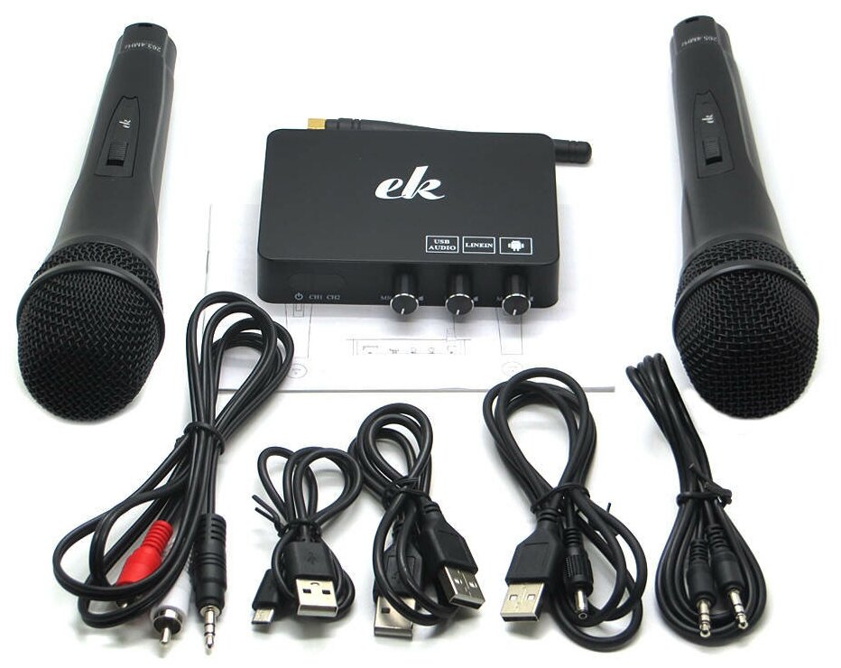 | Подробная комплектация | 1. Основной блок 2. 2 беспроводных микрофона 3. Кабель для зарядки микрофонов micro USB-USB 4. Кабель питания постоянного тока 3,5 mini jack—USB 5. Аудио кабель 3,5 mini jack—3.5 mini jack 6. Аудио кабель 3,5 mini jack—2 RCA 7. Руководство пользователя |