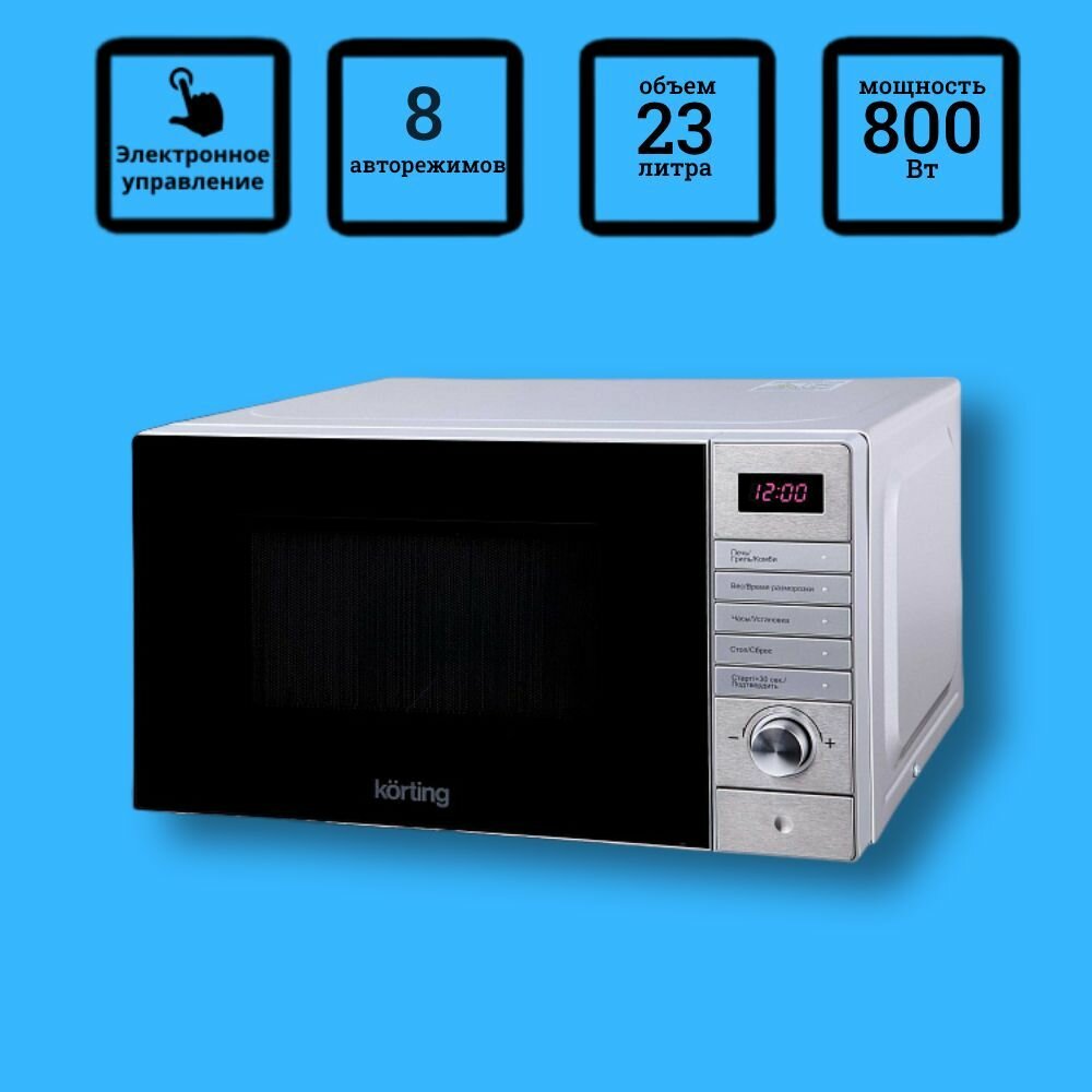 Микроволновые печи Korting/ 29.6х48.5х36.7 см, 23 л, 800 Вт, гриль: 1000 Вт, электронное управление, LED дисплей, 8 автопрограмм, нержавеющая сталь