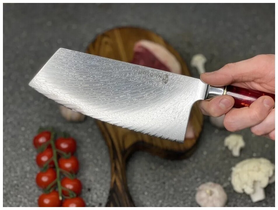 10 цен на Китайский шеф-нож Цай Дао TuoTown CL190 TWR-DK1, рукоять красный акрил+дерево, клинок 19см (VG10-Damascus).