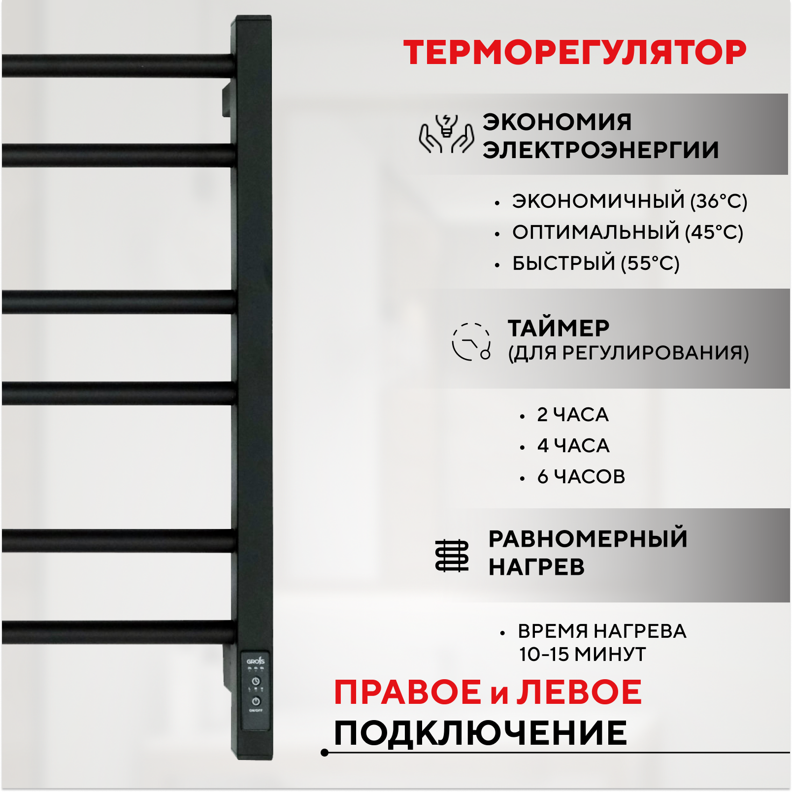 Полотенцесушитель электрический Grois GR-111 500х600 черный матовый подключение справа и слева информация: