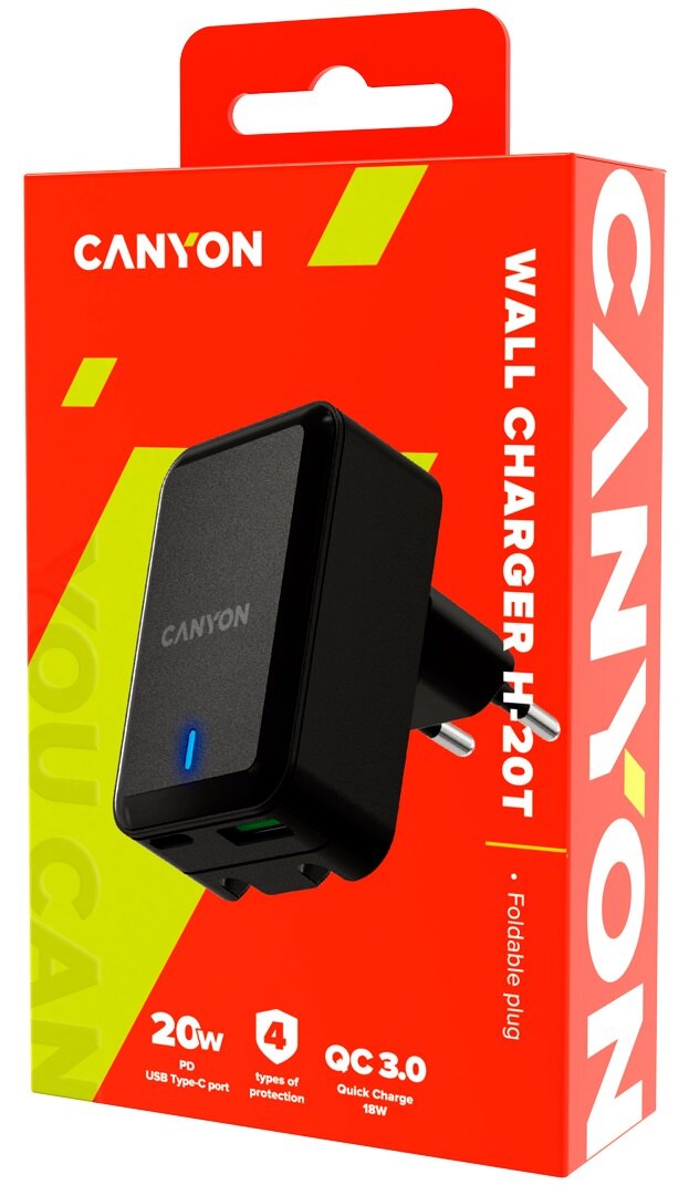 Сетевой адаптер для быстрой зарядки Canyon H-20t, Power Delivery 20W, QC3.0 20W, складная вилка, чер